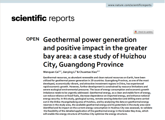 近日,永利6774app手机版官网21級碩士研究生蔡文權在《Scientific Reports》上發表題為“Geothermal power generation and positive impact in the greater bay area: a case study of Huizhou City, Guangdong Province”的研究論文。永利6774app手机版官网為論文第一署名單位,碩士研究生蔡文權為論文第一作者,其導師肖傳桃教授為該文通訊作者。