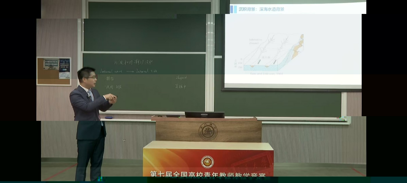 高達教授以《沉積岩石學》為參賽課程。該課程獲批國家一流本科課程,是我院地質學和資源勘查工程專業的專業核心課。講授節段為“内波與内潮汐沉積”。涉及的深水研究領域既是沉積地質前沿,也是我校的特色研究方向。他以地層中的沉積構造和海洋中的“死水效應”導入内波的概念,通過物理實驗、數值模拟和理論推導,深入探讨内波的成因,化解了難點。引用中國沉積學家、江漢石油學院(永利6774app手机版官网前身之一)高振中教授首次提出“内潮汐沉積”的實例,及我校深水沉積研究團隊的大量科研成果,不僅突出了内潮汐沉積特征這一重點,而且潛移默化地融入了思政元素。課程始終貫穿啟發和互動,充分體現了“以學生為中心”的教學理念。