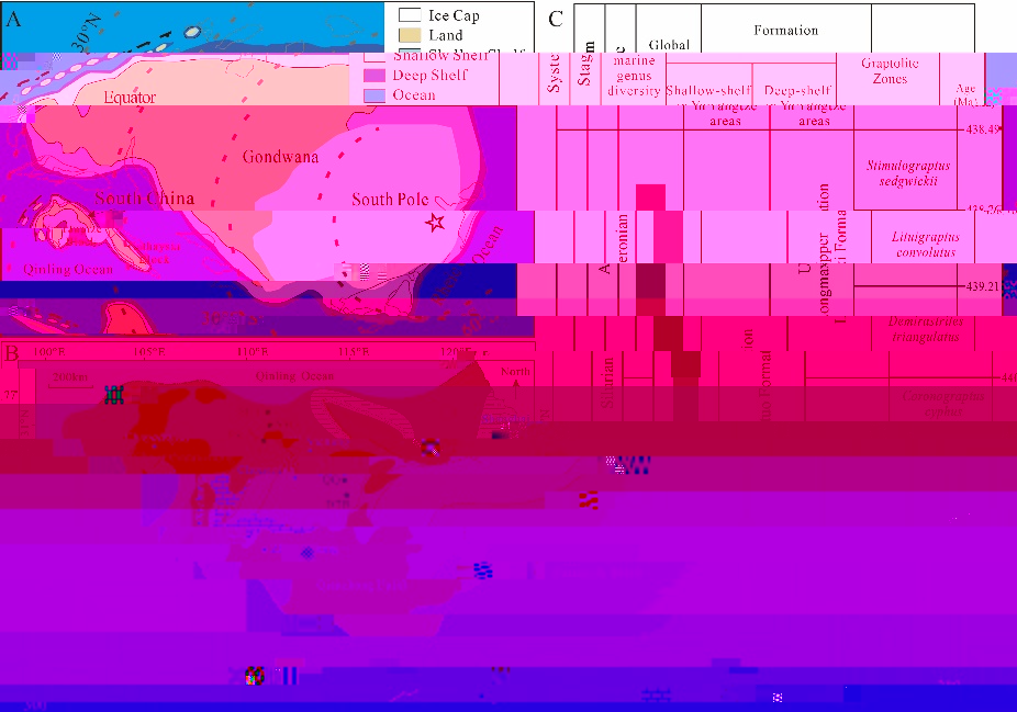 圖1 (A)早志留世時期岡瓦納、華南闆塊古地理圖;(B)早志留世時期華南揚子地區岩相古地理圖;(C)晚奧陶世-早志留世華南揚子地區地層、筆石帶分布圖