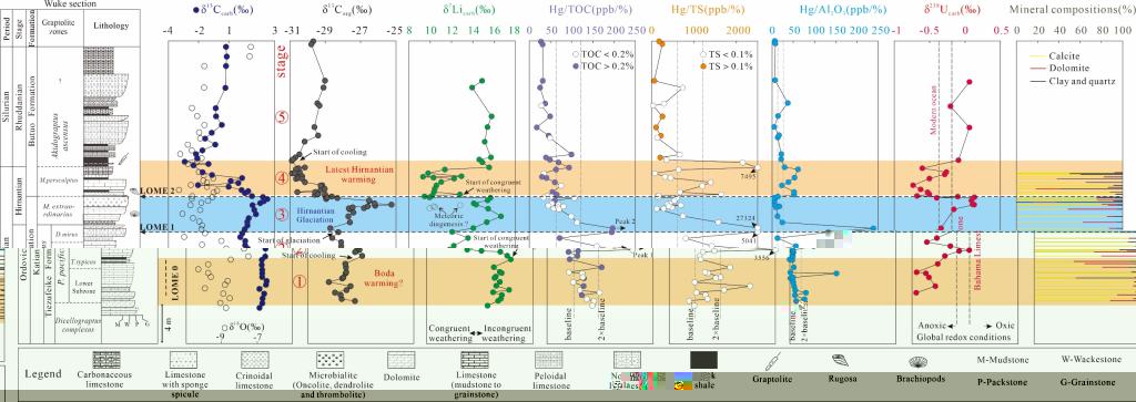 (通訊員:許可)奧陶紀−志留紀轉折期全球古氣溫、生物群類型、古海洋海平面和古海洋水化學條件等都發生了巨大的轉變。重建晚奧陶世時期的古氣候條件,探究極端氣候事件的成因機制,并揭示極端氣候影響下的環境、生物演化關系一直是地球科學領域的熱點與前沿。因此,厘清奧陶紀-志留紀轉折期大陸風化作用和火山活動對厘清這一時期的氣候-海洋-生物演化機制具有重要意義。