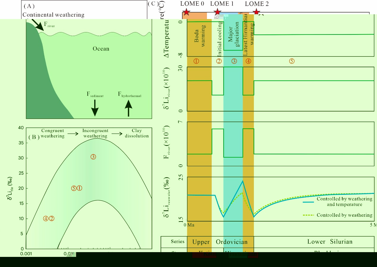 研究成果發表于自然指數期刊《Geochimica et Cosmochimica Acta》上,題目為“Lithium isotope and mercury evidence for enhanced continental weathering and intense volcanism during the Ordovician-Silurian transition”。永利6774app手机版官网為論文第一署名單位,永利6774app手机版官网講師楊向榮為論文第一作者。該研究受到國家自然科學基金(42402123, 41925014, 41690131)支持。該研究選取華南揚子地區上奧陶統鐵足菲克組-下志留統布拖組灰岩地層為研究對象,利用锂同位素和汞含量等方法,重建全球古海洋锂同位素演化,進而探究晚奧陶世-早志留世時期全球大陸風化作用與火山活動對極端氣候事件和生物滅絕的影響。結果顯示,凱迪期具有異常的汞含量波動,指示凱迪期具有強烈的火山活動特征。此外,古海洋锂同位素在晚凱迪期和晚赫南特期發生了顯著的負漂,指示該時期全球大陸風化作用具有一緻性風化的特點(圖1);相反古海洋锂同位素在早凱迪期、赫南特冰期和魯丹期具有較高的值,指示該時期全球大陸風化作用具有不一緻性風化的特點(圖1);經過定量模型計算表明河流風化锂通量在凱迪晚期和赫南特晚期的一緻性風化階段升高了約3倍(圖2)。