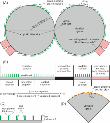 (1)粘土膜降低被包裹碎屑顆粒表面積的機理:作者通過幾何方法定量計算了碎屑顆粒表面積降低與粘土膜屬性參數間的關系,包括包裹率、粘土闆片晶體厚度和粘土闆片晶體間隙寬度(圖2),且其與包裹率間呈抛物線關系,而非負相關線性關系。