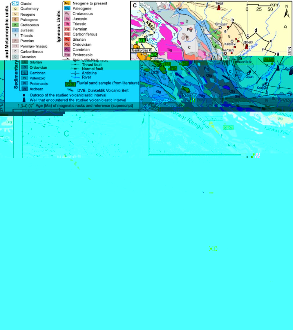 圖5.由于火山岩漿本身貧锆石,可以通過锆石U-Pb年齡譜判斷火山碎屑的潛在源區,發現柯克亞地區的火山碎屑跟其他地區不同