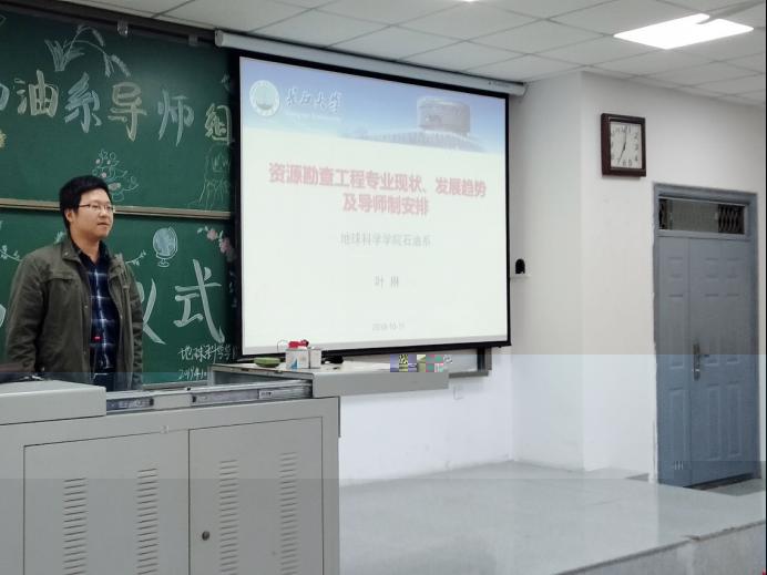 資源勘查工程專業導師組活動中,葉琳老師從專業簡介、專業發展、個人發展和導師制四個方面進行了詳細講解。首先,葉琳老師給同學們講述了石油這個詞的由來,同時向同學們展示了現在的鑽井設備和鑽井工序。緊接着他以中東地區為例講述了石油的戰略意義,由此引出了專業培養模式和“中俄能源學院3+2”、“卓越計劃3+1”等多種培養計劃。最後,他以習近平總書記提出的“加大油氣的開發力度”的戰略目标鼓勵同學啟航夢想,迎接石油行業的春天。