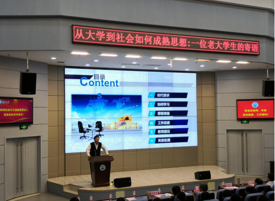 本次講座的主題為“從大學到社會如何成熟思想”,劉玉強教授以一位老大學生的視角,分别從時代要求、學習方法、思想準備、工作态度、教育建議及事業與生活六個層面為到會師生開展了一場形式活潑、内容深刻的主題教育活動。