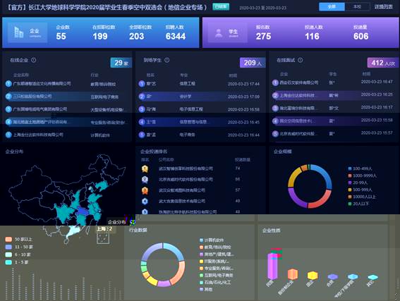 本次雙選會參會單位55家,共提供職位數203個,設置招聘人數達6344人。涉及單位以武漢為主,此外還包括來自北京、廣東、上海、陝西等多個省/市,提供包含軟件工程師、無人機航測工程師、遙感技術工程師以及輔導老師等多種崗位。參與本次空中雙選會的學生不僅有我院學生,還有本校其他學院和其他高校的學生,共報名275人,當日到場209人,在線面試412人次;共計投遞簡曆116人,投遞簡曆量606份,其中本校學生報名人數118人,投遞簡曆量534份,占比88.12%。