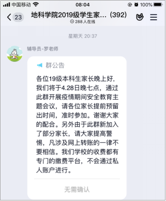 為保障此次線上安全教育專題會議順利、有效開展,我院學工辦全體老師前期做了充分準備。一是4月24日在網上進行了集體讨論與籌劃,确定了專題會議的開展形式、主要内容、具體安排等;二是抓住疫情期間學生居家學習教育管理的重難點,制作專題會議PPT;三是以“家庭責任與學會溝通”為主題,拟定防疫期間學生居家學習溫馨提示,及安全責任告知書;四是各年級輔導員将專題會議安排及要求發布給學生及家長;五是利用輔導貓及短信平台向學生及家長推送關注學生心理健康短信。