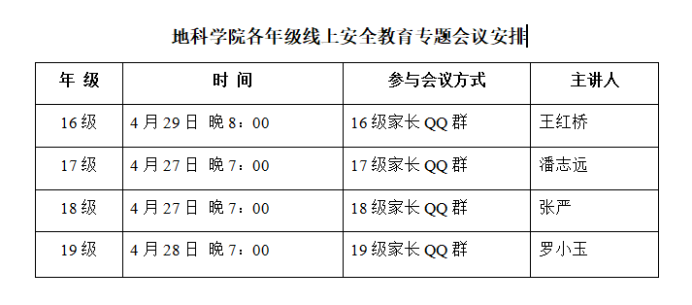 (通訊員 郭霖)為進一步做好常态化疫情防控下學生教育管理工作,使家校聯動形成全力,共同保障學生防疫期間居家學習安全。我院于4月27日~29日分年級召開“疫情期間居家安全教育”專題會議,會議由各年級輔導員主持,學生及家長通過各年級家長QQ群參加,學工辦全體老師參會。