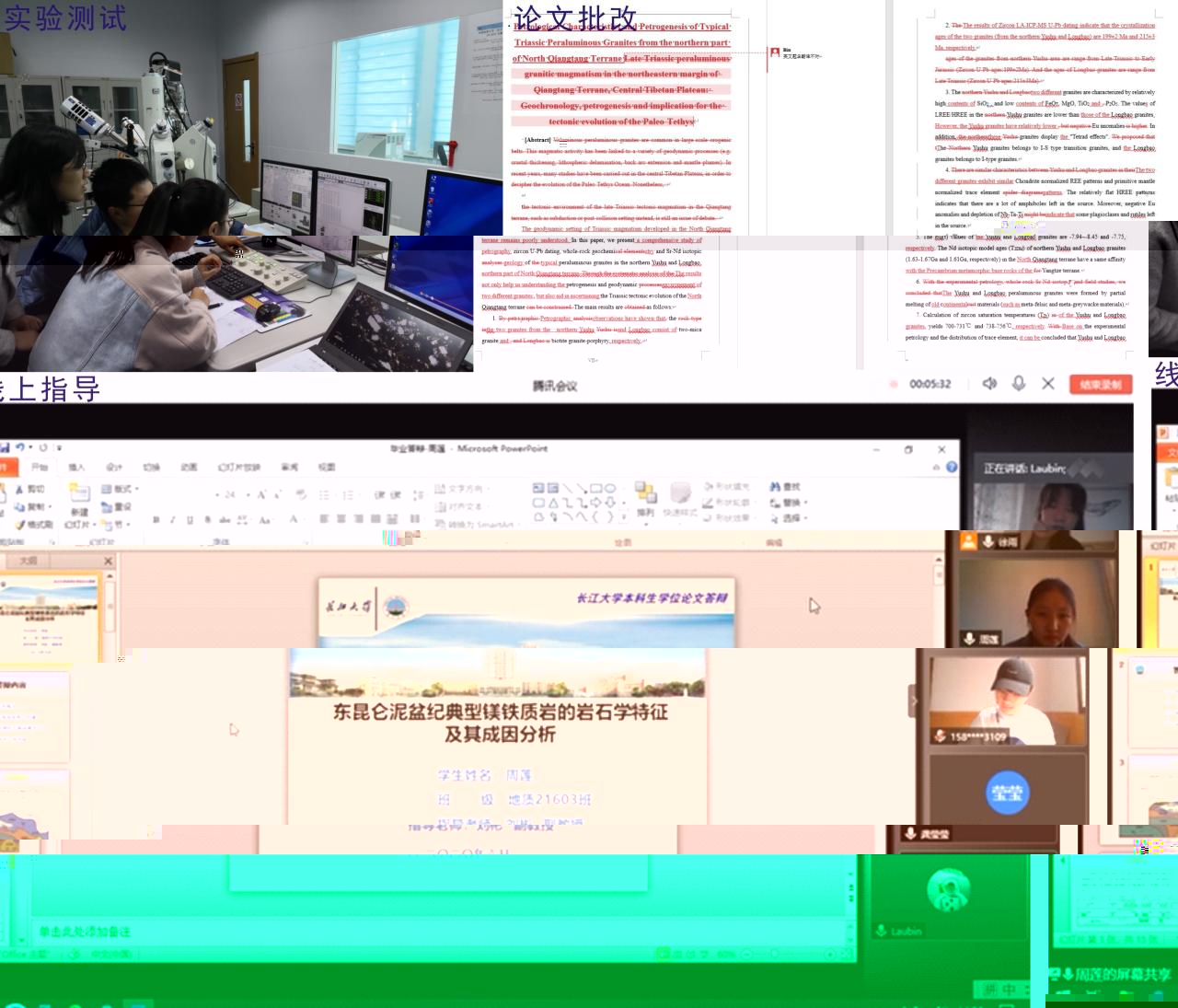 我院的青年教師劉彬副教授在非常重視畢業生地質思維能力、科研技能和學術規範性等訓練。在學生确定選題後,便有針對性地向學生提供與論文研究相關的文獻,啟發學生從多個不同角度思考科學問題,并且親自帶領和指導學生進行樣品處理與上機測試。為解決疫情期間無法進行面對面指導這一問題,劉彬老師還利用騰訊會議和QQ等社交軟件開展線上指導與 “一對一”實時交流,及時解答學生的論文問題,引導和鼓勵學生們在疫情期間調節各種負面情緒、不畏困難、靜心學習,督促學生高效地完成論文工作的各個環節。