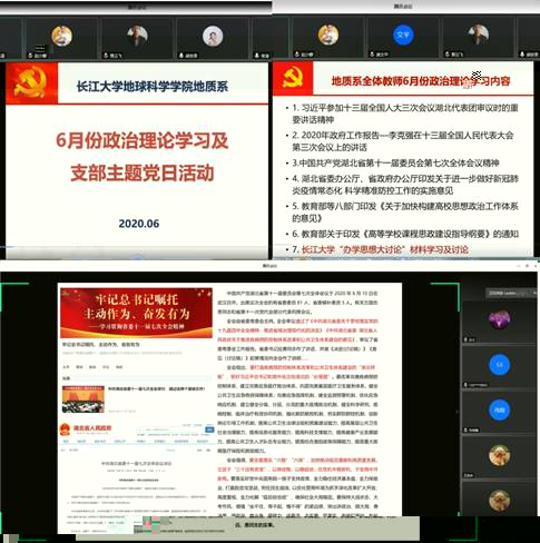 2020年6月18日下午,永利6774app手机版官网地質系全體教師通過騰訊會議形式開展集中政治理論學習、支部主題黨日活動以及地質系教研活動。