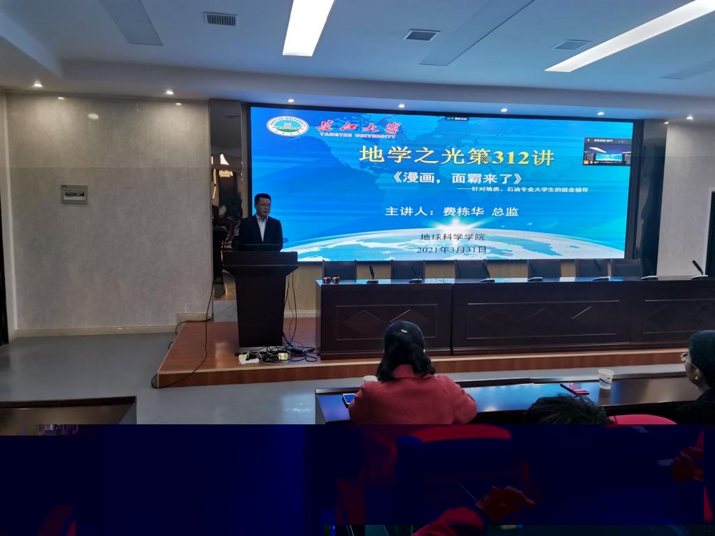 (通訊員 王鈴淇)3月31日下午14時,我院地學之光第312講開講,由來自廣東宏川智慧股份有限公司行政中心的費棟華總監在B教110為我院全體大三同學講授就業指導課。會議由院黨委副書記任倩主持,學工辦全體輔導員參加。