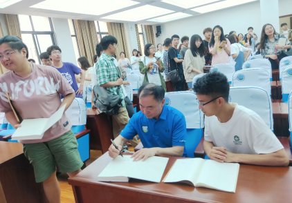 講座最後,歐陽永林教授與在座師生熱情互動,就當前中國非常規油氣勘探開發面臨的問題進行了深入的交流與探讨,并為與會師生贈書《天然氣地震學》,大家紛紛邀請歐陽教授在新書上贈言、簽名。