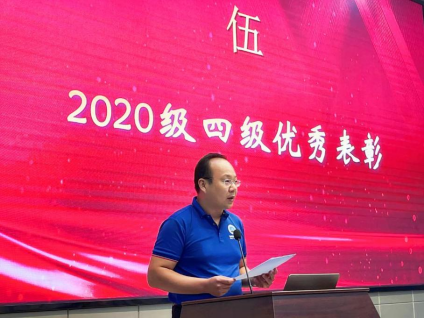 為表彰先進,進一步推動優良學風的形成,我院與典禮一同開展了2020級四級優秀表彰大會。我院2020級本科生在上半年全國大學生英語四級考試中取得了突破性的好成績。在副院長韓登林宣讀表彰文件後,地信系主任李功權、地質系主任胡忠貴分别為兩個四級通過率超過80%的四級先進集體地信22001、地質22001班級代表頒獎;副院長丁四兵與石油系陳鵬書記分别為五名四級均超過600分的優秀個人進行頒獎。