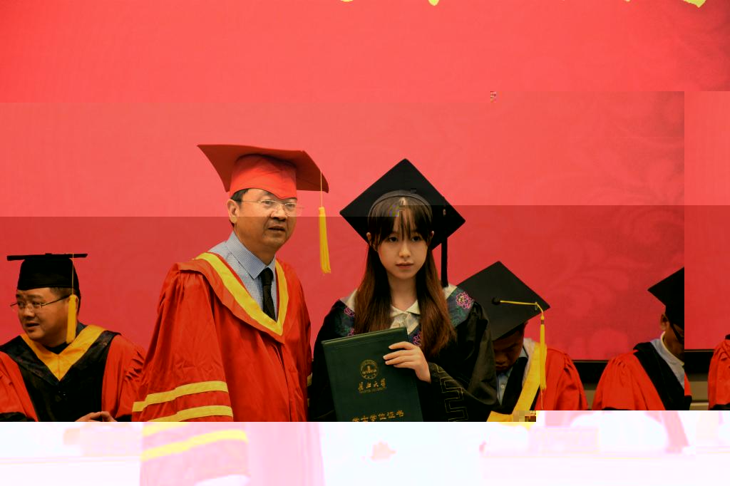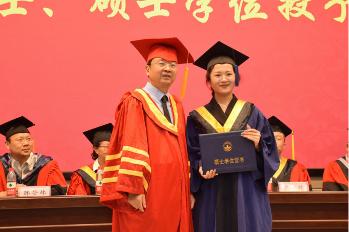 副書記任倩宣讀《關于同意授予黎孟琦等270名同學學士學位的決定》,吳楠副院長宣讀《關于同意授予張俊龍等105名同學碩士學位的決定》。胡明毅院長為獲得學位的同學依次頒發學位證書,援正流蘇并合影留念。