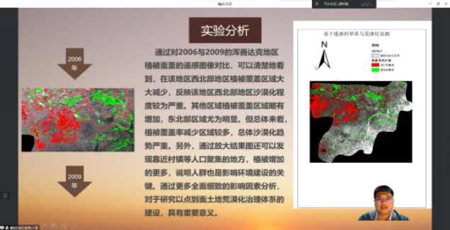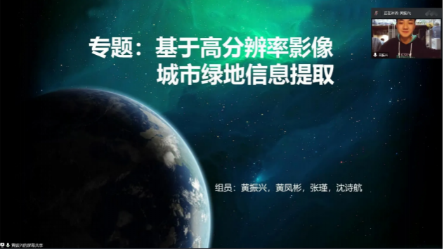 第一個答辯環節,選手們根據自己的選題和研究内容分别從選題背景與目的、數據與技術路線、數據處理流程、過程總結等四個方面進行介紹。重點講解了如何運用遙感處理軟件并結合當前環境保護形勢,來處理和分析已有的數據,最終得出結論。其中,劉亞唯組以《基于像元二分模型的植被覆蓋度反演》為選題,重點介紹了“像元二分模型”在數據處理過程中發揮的重要作用。