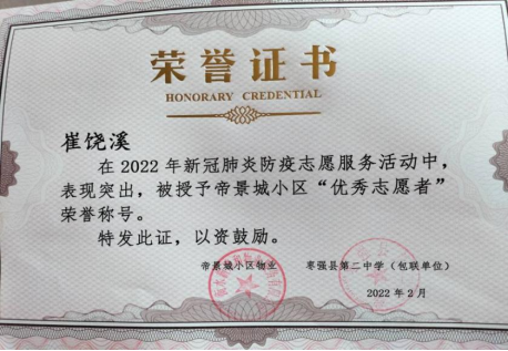 春節來臨之際,大家都沉浸在新年的喜悅中,突如其來的疫情悄悄地蔓延至河北省衡水市,立即進入疫情緊急防控狀态。地質22101班崔饒溪積極響應号召,在社區内分發出入證,對社區内的常住戶進行登記,對外來人員進行嚴格把控。面對正月北方的寒風大雪,她從未缺席。當遇到一些嫌麻煩、不配合的叔叔阿姨時,她也耐心勸告,從不懈怠。