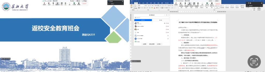 (通訊員 王少甯)武漢新一輪雨雪極端天氣來襲,為确保學生平穩有序返校,我院學生事務辦公室接到校黨委學生工作部工作要求後,于2月20至22日組織全體研究生參加以班級為單位,通過騰訊會議等平台召開的2024年春季學期返校安全教育班會,會議由各班班長主持。