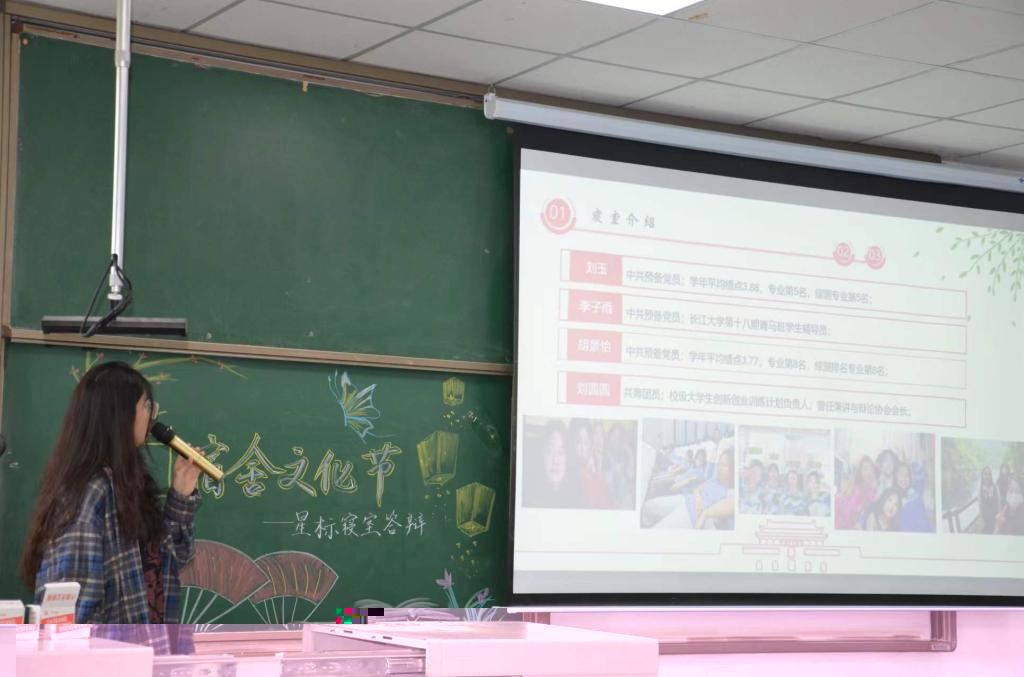 活動第一項為“星标寝室”選手答辯。每個寝室紛紛展現各自的閃光點,制作精美的PPT結合富有感情的演講讓人身臨其境,每個“五家”寝室述說着自己寝室的動人故事,現場掌聲接連不斷。其中不乏有經常參加志願服務活動、樂于助人的校内四棟212寝室;也有一個寝室學年平均績點3.5以上的校内四棟238寝室,讓人印象深刻。