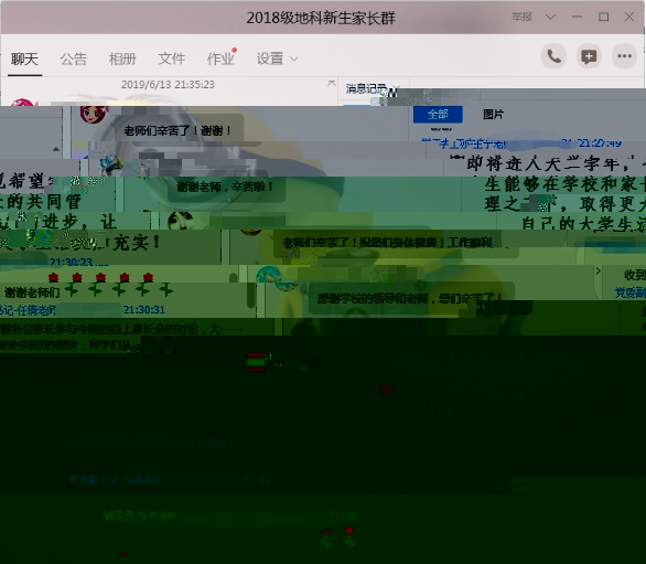 6月13日晚8點,我院在“2018級地科新生家長群”中召開了主題為“誠信應考,平安一夏”2018級本科生第三次線上家長會,學院黨委副書記任倩、輔導員潘志遠、張嚴以及學生家長共計140餘人參與了讨論,家長會由年級輔導員王甯主持。