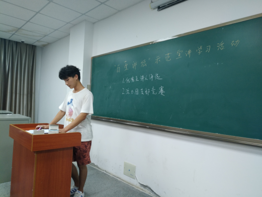 組織部部長上台進行示範宣講。他講道:“此次‘百生講壇’活動,我們會進行優秀主講人評選活動和活力團支部競賽。”他希望同學們能踴躍報名參加,為宣傳貫徹習近平新時代中國特色社會主義思想和黨的十九大精神“四進四信”做出自己的貢獻。