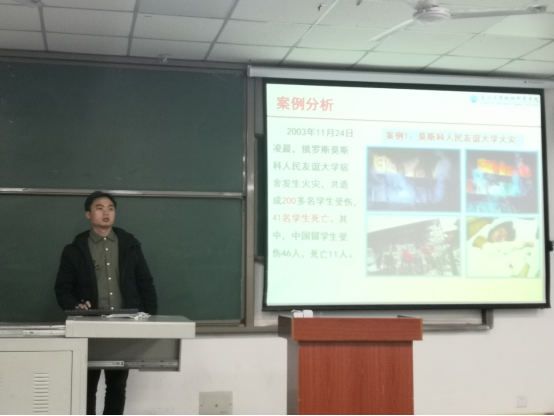 接着,為進一步提升學生安全防範意識,加強宿舍安全管理工作,張嚴老師面對全體班長進行了宿舍文明安全教育。首先,他對我院前期宿舍安全檢查情況進行了通報與總結,叮囑同學們要注意用電安全,排查可能存在的安全隐患,杜絕使用任何違規電器。緊接着,張老師為大家講解了宿舍火災發生的原因、火災的預防以及自救措施,強調學生應主動排查安全隐患,防範于未然,做到“我懂安全,我要安全,事事安全,人人安全”。