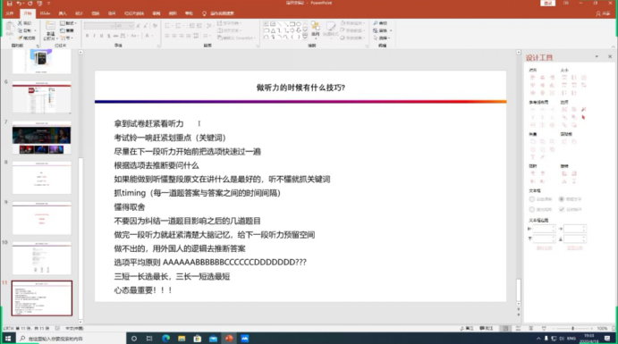 此次交流會旨在使19級本科生更好地面對英語四級考試的聽力部分。會議伊始,地信21801班的代慧敏同學以“循序漸進”的英語學習方法為出發點,着重強調了平時積累的重要性,同時,告誡同學們創造一個濃厚的英語學習環境是學好英語的必要條件。而後,來自資工(油光)21801班的柴浩博同學則提出要端正自身态度,重視英語學習。在平時的英語課堂上應積極跟上老師進度、認真完成課程作業;課下則還需複習鞏固老師所講的知識點:對于大學生英語四級考試,柴浩博表示所有的方法、技巧都必須建立在實力的基礎上,告誡19級本科生們應注重積累,夯實基礎。