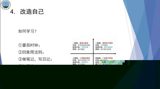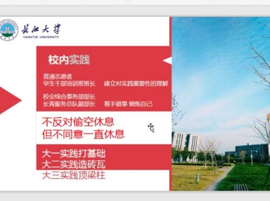 30日晚7點,樊柯廷、李康、王明敏3名同學分别進行學習經驗分享。首先為我們做分享的是樊柯廷。他從自己的實踐經曆告訴我們,想做好一件事,你必須要有積極的态度,緊接着他又說“大學可以偷空休息,但不能一直休息,因為大學的意義不僅僅局限于宿舍。”最後,他告訴同學們,“大一實踐打基礎,大二實踐造磚瓦,大三實踐頂梁柱。”你可以通過一些企業實習,明白你更适合于什麼崗位。緊接着,為我們做分享的是李康。他談到大學生活要有明确的目标,目标就像你深夜航海時的燈塔。同時也認為大學并不是高中老師所講的那樣絕對自由。在大學,你必須學會自律,才能使得你的目标更加堅定。最後便是要務實,拒絕虛假,在實踐中不斷探索,這樣才能更加深刻地去了解任何一件事。最後是王明敏為同學們分享經驗。她先從自己方法講起,她表示自己每天都會把要做的事列一張表格,這樣就可以均衡地分配時間。同樣地,态度也決定着你能否做好一件事,當你有求真務實的态度,就沒有什麼事能夠難倒你。