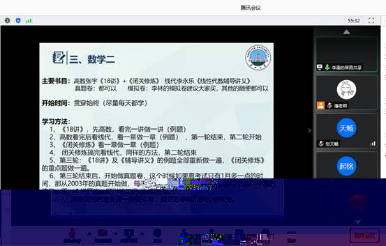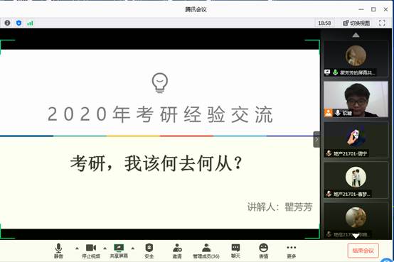 6月11日晚7點半,地信21602班瞿芳芳同學和地信21601班呂文超同學給2017級地信專業開展線上考研經驗交流,他們分别以優異的成績被武漢大學和中國礦業大學錄取為碩士研究生。作為一名成功考上武漢大學的學霸,瞿芳芳同學首先告誡考研的同學們要“忠于現實,明确目标”,在考研的路上一定要“耐得住寂寞,頂得住誘惑”,随後她就考研常識、考研規劃和備考初試複試進行了詳細解讀,她強調了夏令營活動的重要性,這是一個可以幫助我們在同等條件下優先被錄取的渠道。今年考取中國礦業大學的呂文超同學首先就地信專業考研難度進行了分析,他強調了“考研務必明确方向,切勿盲目跟風”,同時他也分享了優質考研資料的獲取渠道并強調了關注時事熱點的重要性,最後他就如何調整複習心态進行了切身介紹,同學們紛紛表示獲益匪淺。