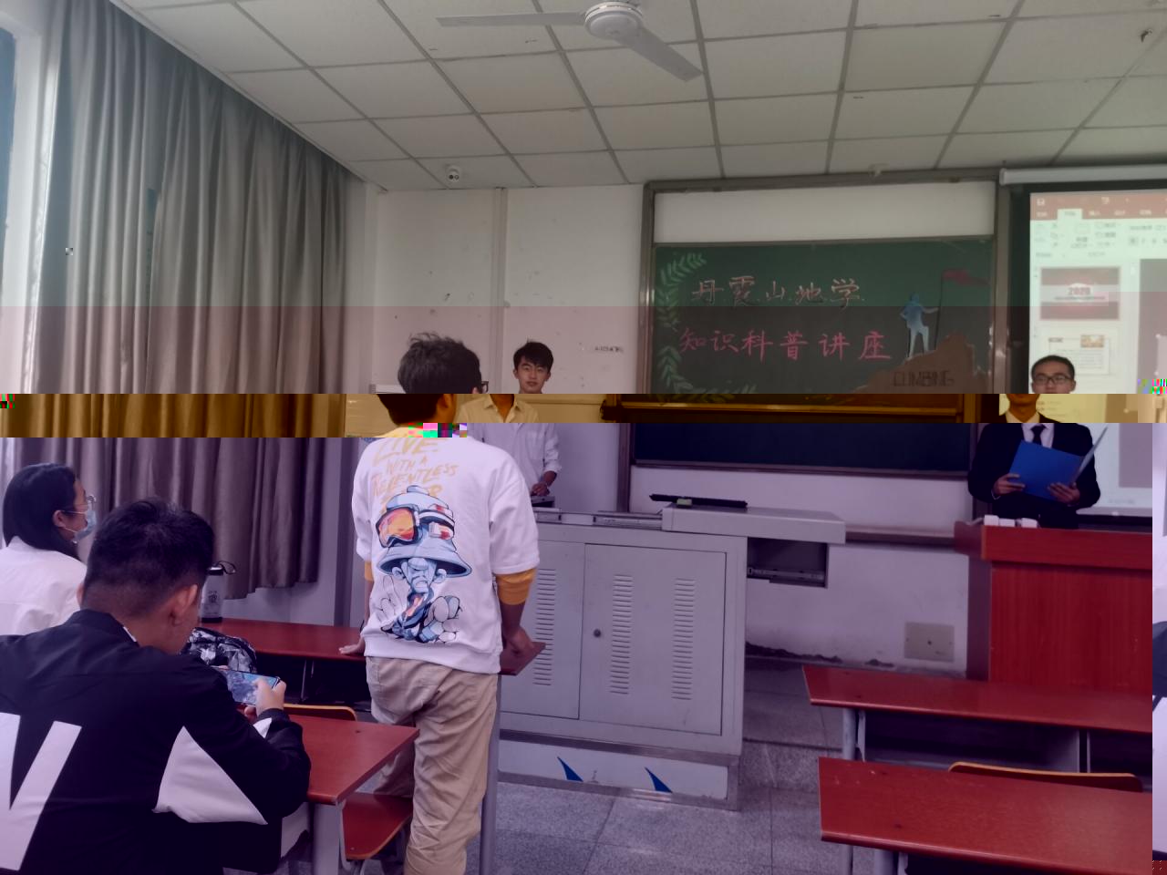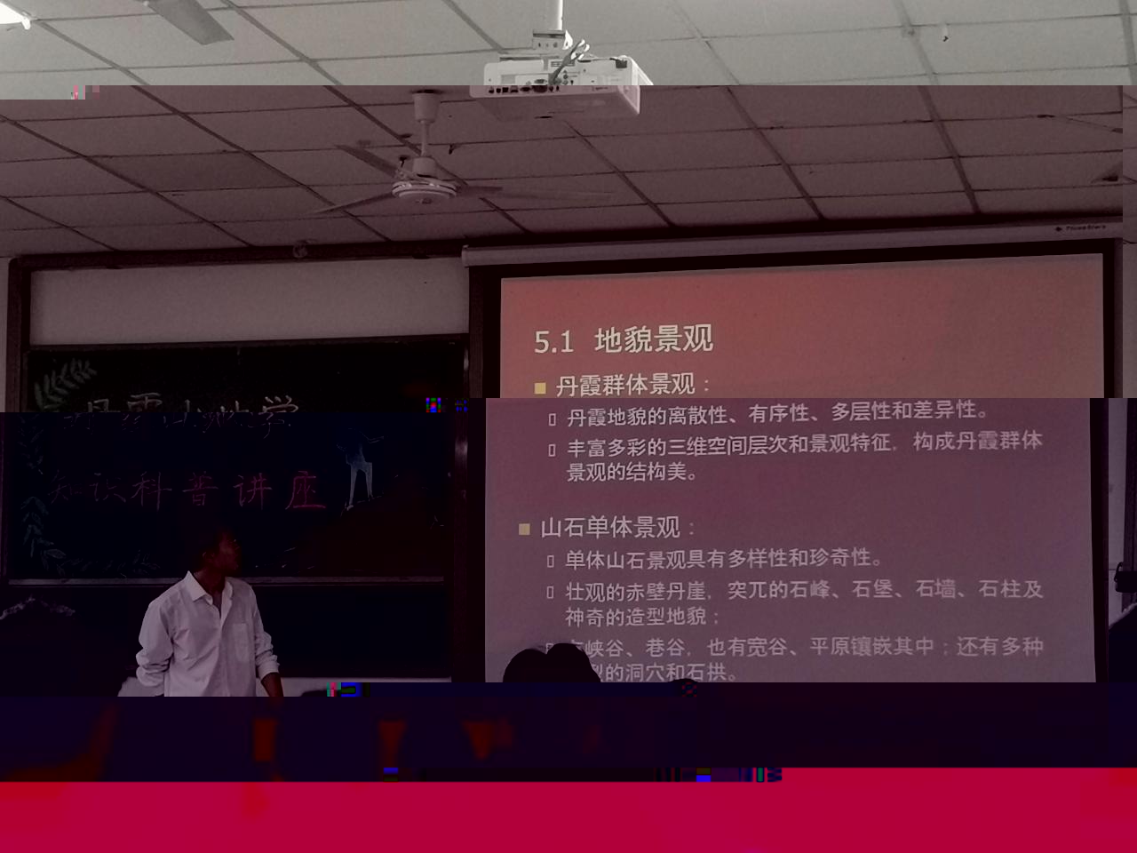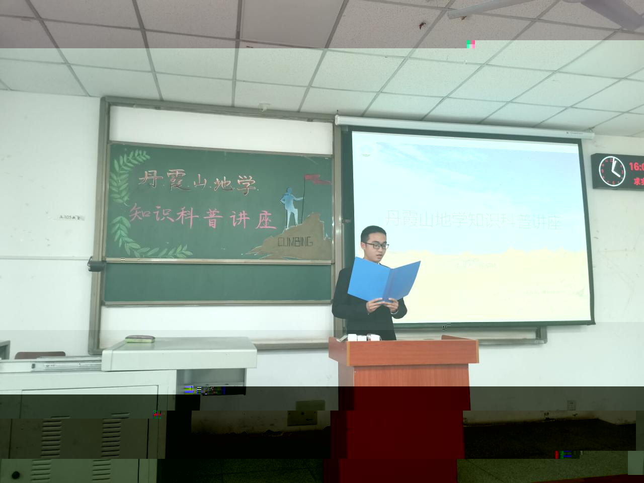 講座開始,首先由主持人陳昱涵為我們簡單介紹了主講人徐明帥以及他所參加志願活動的組織“腳爬客”。緊接着,徐明帥以兩段簡短的丹霞山視頻開始了今天的演講,這兩段視頻記錄了他們在丹霞山科普學習生活的點點滴滴和丹霞山的美景,他根據自己的所見所學所感生動形象地講述了丹霞山的地貌的特征以及形成過程。