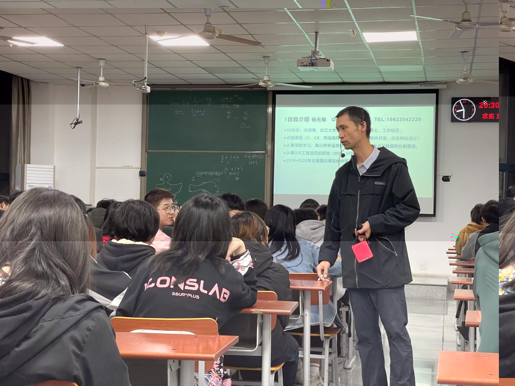 地信專業邀請到了楊元維老師為同學們進行交流分享。楊老師生動幽默的語言和淵博的學識一下子就吸引住了大家的注意力。簡單的自我介紹後,楊老師圍繞“地信專業的特點及前景”這一主題為同學們進行詳細講解。随後,楊元維老師分享了自己的求學與工作經曆,提醒并鼓勵同學們學習要高效。最後,楊元維老師與同學們進行了交流互動,在學習、生活等方面為同學們一一指點迷津。