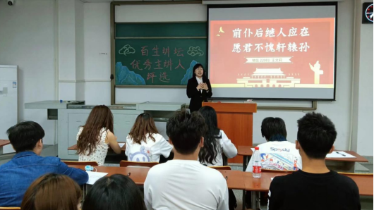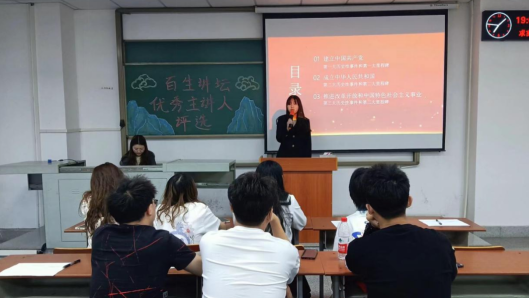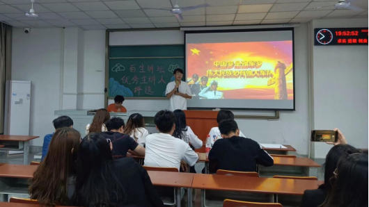(通訊員 王鈴淇)為進一步學習貫徹習近平新時代中國特色社會主義思想和慶祝建黨一百周年,我院于5月5日晚7時在A教306開展以“青春心向黨,建功新時代”為主題的百生講壇活動。此次活動由團委學生會主席鄭娜主持,學生會全體部長參與此次活動。