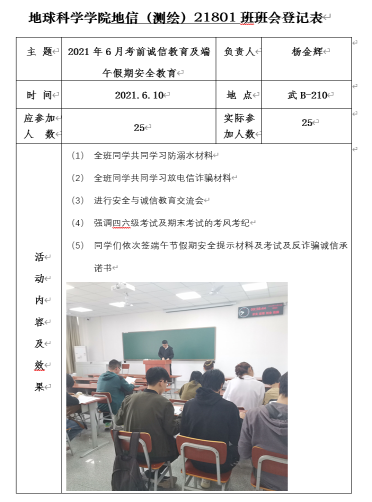 根據會議要求安排,我院所有班級已于6月11日下午17:00前開展考風考紀、反詐騙及安全教育主題會議,全院學生100%簽署 “四六級考試承諾書”、 “端午節”假期安全提示。