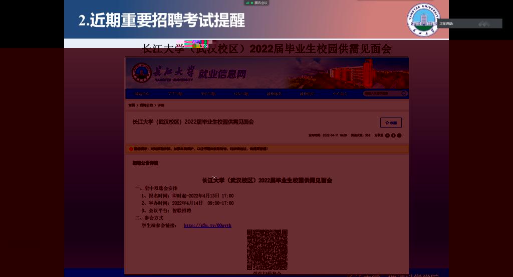 會上,張老師從簽約注意事項、近期重要招考信息、畢業生調檔等方面為同學們做了解答。在簽約過程中要注意細節,保障自己的權益,簽約結束後一定要按照甲方要求提交紙質協議;當前,正值春招旺季,如武漢校區2022屆畢業生校園供需見面會、中國石油2022年高校畢業生春季招聘、湖北省省直事業單位2022年統一公開招聘等校園供需見面會、國企和事業單位招考也正在進行中,希望同學們抓緊時間,把握機會;最後在畢業生調檔答疑方面,他從政策、往屆同學們的種種經驗等方面做了詳細解答。