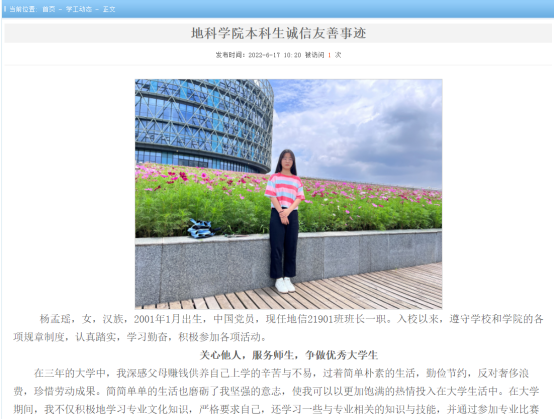 為進一步激發争做誠信大學生的自豪感和使命感,我院積極開展“誠實做人、誠信治學、誠信就業”的先進典型評選工作,在各年級積極組織優秀學生進行申報,選拔出楊孟瑤等4名同學為代表的誠信友善典型,通過學院官網進行廣泛宣傳, 引導廣大學生理性消費、珍視誠信、勤奮有為,營造人人講誠信、崇尚誠信、友善關愛的育人氛圍。
