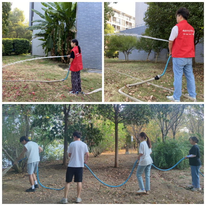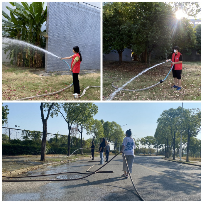 同學們3—4人為一組,跟随後勤工作人員,來到負責區域,進行綠化帶澆灌。面對綠化帶面積大、澆水水管重、水流沖擊力強等困難,同學們熱情高漲,毫不畏懼。伴着知音湖畔清爽的秋風,同學們充分發揚不怕髒、不怕苦、不怕累的精神,分工合作、有序推進,用手中的水管仔仔細細地澆灌每一片區域、每一棵植物,他們的身影是校園内一道靓麗的風景線。在全體成員的不懈努力之下,綠化帶中的樹木除去了雜塵,喝飽了水分,重新煥發盎然生機。