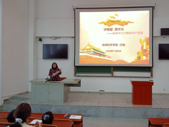 任倩老師首先以《講奉獻勇作為——做新時代合格共産黨員》作為黨課主題,為大家講解了新時代黨員的責任與義務,讓大家對照标準找差距,主動學習,提升自已。随後,任老師向大家生動講述了疫情期間我院抗疫志願者向栩、吳金銘等同學勇敢抗疫的故事和今年6月份畢業生返校志願者的無私奉獻、樂于助人、默默奉獻的事迹,稱贊他們也是“最美逆行者”,真正起到了先鋒模範帶頭作用。最後,她呼籲大家向身邊的榜樣學習,思想與行動上都要積極向黨組織靠攏,以不怕困難、勇擔使命的實際行動展示地科學子風采。