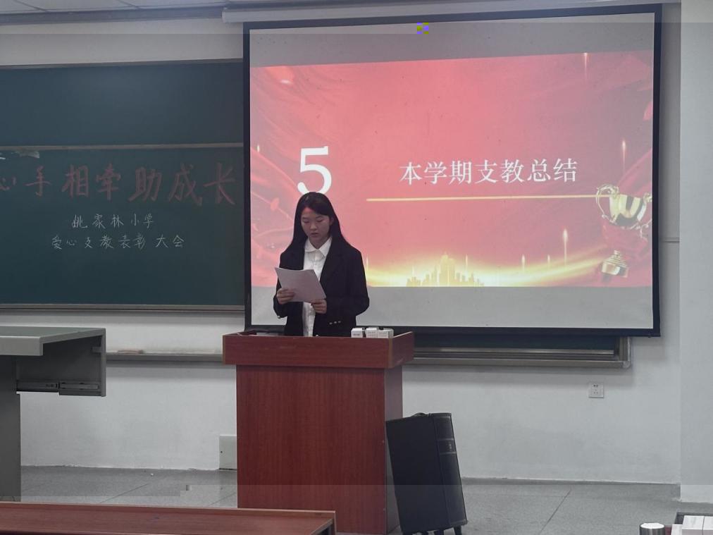 頒獎結束後學生會成員王譽晗對上學年支教活動進行總結,分享在過去一年組織支教活動過程中的收獲,代表部門全體成員感謝大家對活動的支持,同時宣布本學年支教活動開啟,号召大家繼續積極參與支教活動。