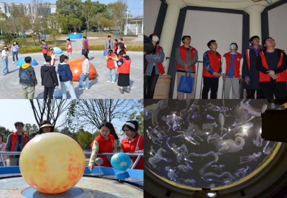 首先參觀的是天體模型、星座分布等展覽,在講解員的講解下,同學們和社區居民們了解了“天幹地支”計時法的由來,以及二十四節氣的劃分依據。來到中央的廣場,一個個巨大星球模型矗立于眼前,令人真切地感受到宇宙的廣袤與深邃。随後,在圓頂投影室中,沉浸于璀璨星空之下,仿佛置身于銀河之中,大家無不為自然界的神奇與美麗所折服。