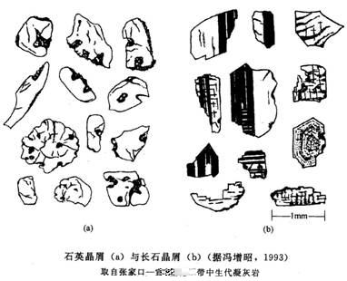 晶屑多為早期析出的斑晶熔漿炸碎而成,大小一般不超過2~3mm,常呈棱角狀,有時保持原來的部分晶形,其成分多為石英、長石、黑雲母、角閃石、輝石等。