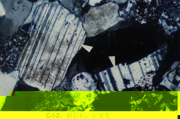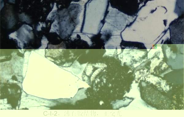 C—I—12:①顆粒:微斜長石、正長石(高嶺石化)、長石(再生)。②雜基成分:粘土礦物。③膠結物成分:矽質膠結物(微晶石英)。