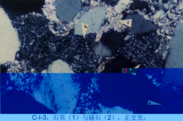 C—I—1:①顆粒:石英(有再生加大現象)、燧石、粘土岩岩屑。②雜基成分:粘土礦物,少量細粉砂級的石英碎屑。③膠結物成分:以矽質為主,有少量鐵質,矽質已重結晶為顯晶質石英,使石英碎屑顆粒再生加大;鐵質成為石英碎屑顆粒的周邊。④膠結類型:孔隙式膠結。