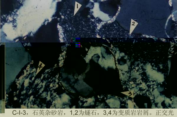 2、通過對C—I—4長石質岩屑砂岩的手标本和岩石薄片的一般觀察,了解長石質岩屑砂岩的主要特征。