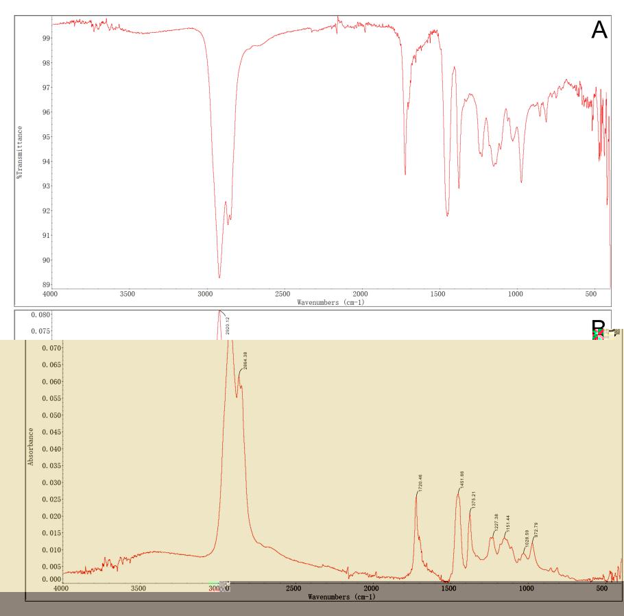圖1 (A)目标樣品的FT-IR光譜;(B)ATR校正後的具基線校正的FT-IR光譜。