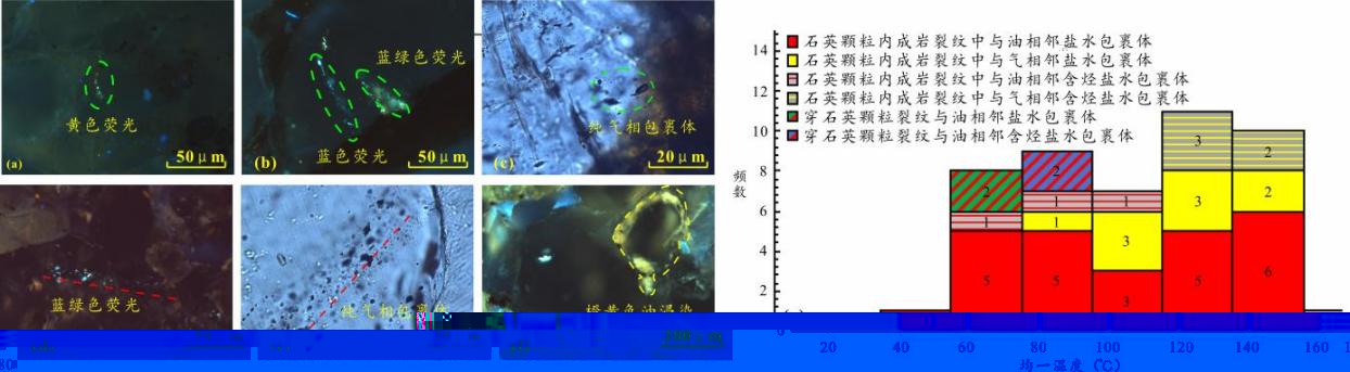 圖1儲層包裹體顯微照片(a-f)與烴類包裹體伴生(含烴)鹽水包裹體均一溫度分布圖(g)