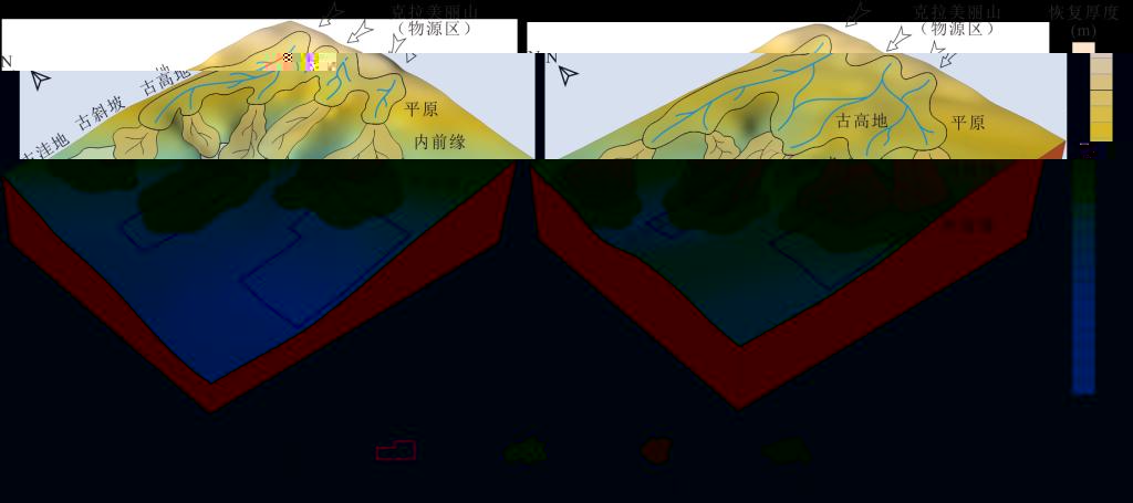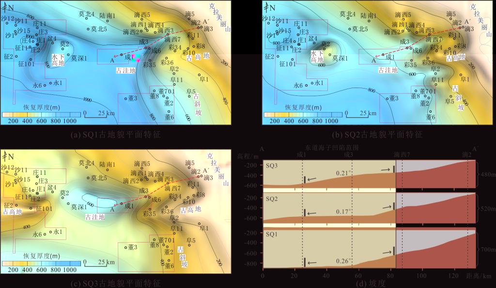 淺水三角洲廣泛發育于陸相湖泊環境,是目前油氣勘探研究的熱點。該研究選取東道海子凹陷下侏羅統八道灣組及三工河組廣泛發育的淺水三角洲為研究對象,基于東道海子凹陷及周緣大量測錄井、岩心、地球化學測試等資料,利用殘餘地層厚度法,并結合去壓實校正的方法恢複古地貌(圖1),對沉積相、古地貌、古氣候及相互作用進行了綜合研究,并建立了古地貌與古氣候共同控制的淺水三角洲的沉積展布與演化模式。