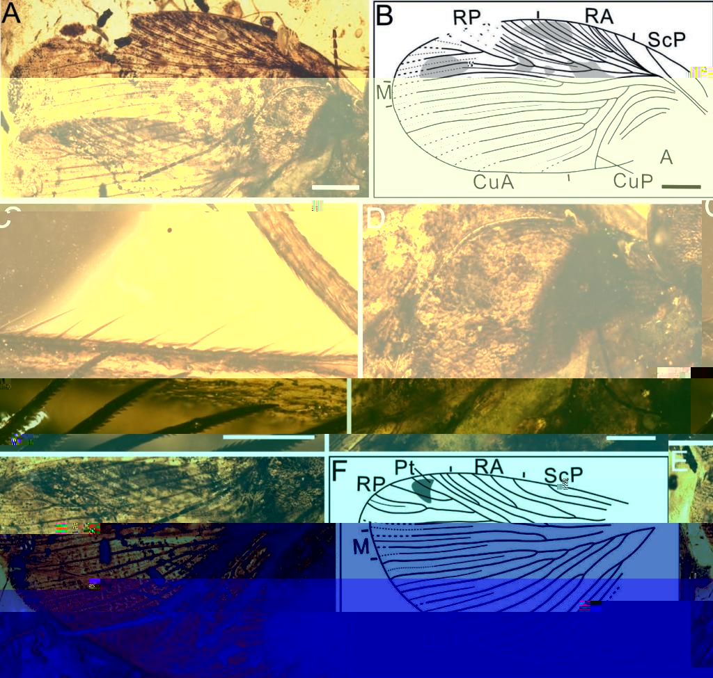 圖3(A)和(B)Maculosala circularis左前翅細節照片及線描圖;(C)Maculosala circularis前翅剛毛細節照片;(D)Maculosala circularis前翅臀區細節照片;(E)和(F)Maculosala circularis左後翅細節照片及線描圖。比例尺A,B=1mm,C=0.2mm,D,E=0.5mm,F=1mm