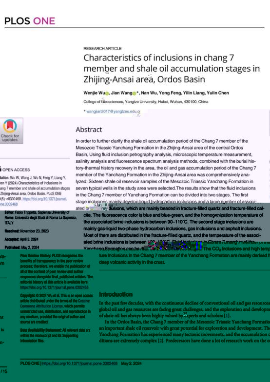 地科學院碩士生吳文傑在《PLOSONE》發表題為“Characteristics of inclusions in chang 7 member and shale oil accumulation stages in Zhijing-Ansai area, Ordos Basin”的研究論文。永利6774app手机版官网為論文第一署名單位,碩士生吳文傑為論文第一作者,教師王健為通訊作者。