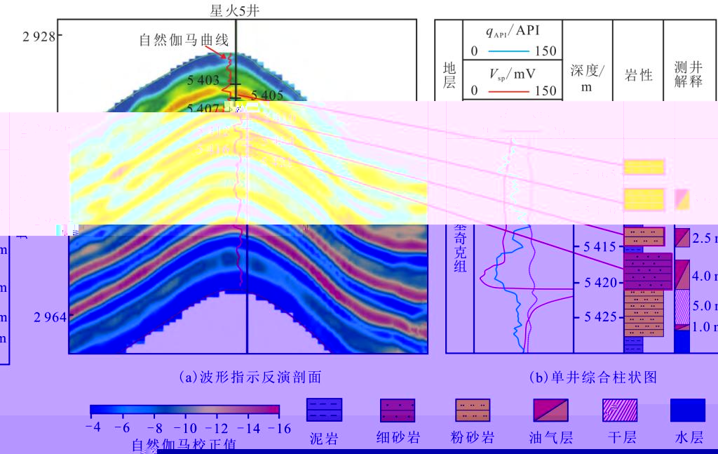 圖1 星火5井自然伽馬波形指示反演剖面與綜合柱狀圖