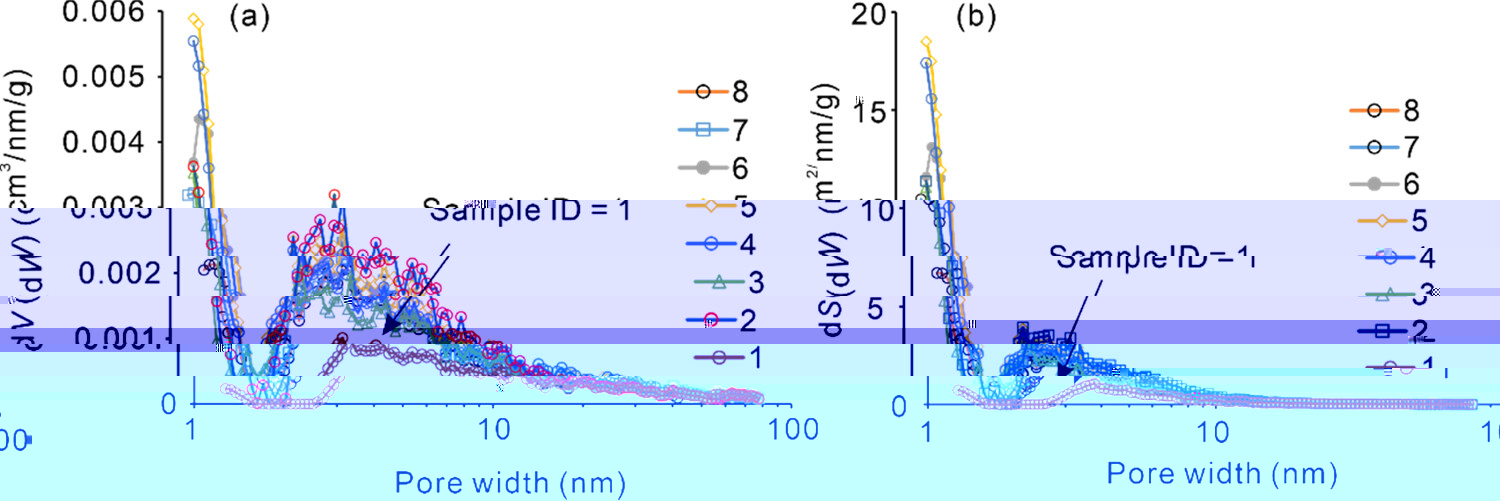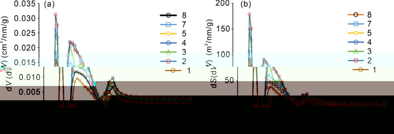 圖3 從N2 吸附等溫線獲得的孔徑分布。(a)孔體積分布與孔寬的關系。(b)孔SSA與孔寬的關系。dV/dW 和dS/dW 圖均顯示孔徑的單峰分布。然而,樣品1表現出不同的方式,孔寬變大,但孔體積和孔SSA變小。
