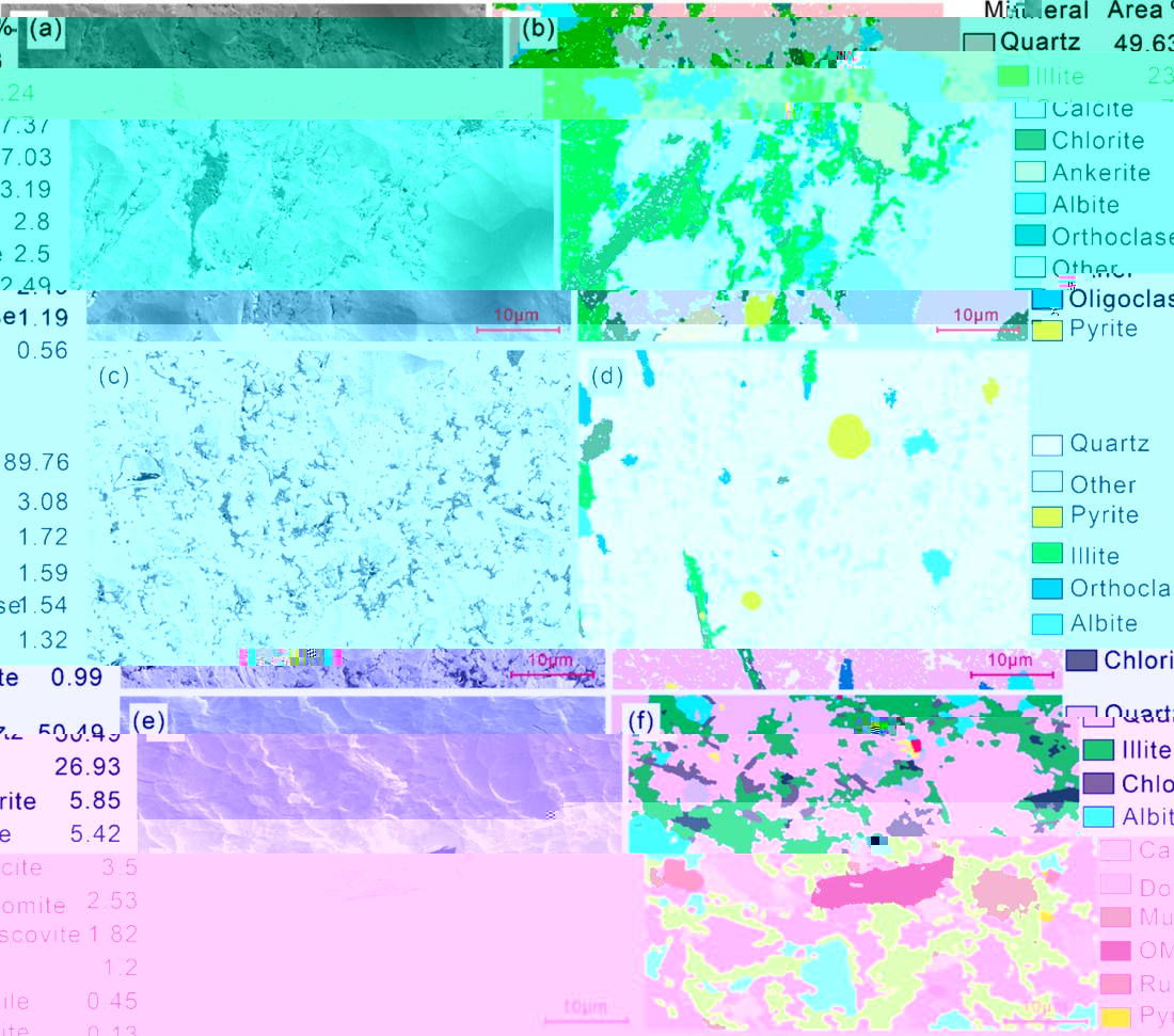 圖1 通過AMICS獲得的礦物成分和從相應的FE-SEM圖像獲得的孔隙分布。左:FE-SEM圖像。右圖:左側FE-SEM圖像中相同樣品的礦物成分分布。OM =有機物。(一、二)樣品ID = 8,大多數孔隙位于有機物内,然後位于礦物基質之間。(c,d)樣品ID = 5,孔隙主要出現在有機物中,然後是石英顆粒的邊緣。(e,f)樣品ID = 1,觀察到很少或沒有有機物。